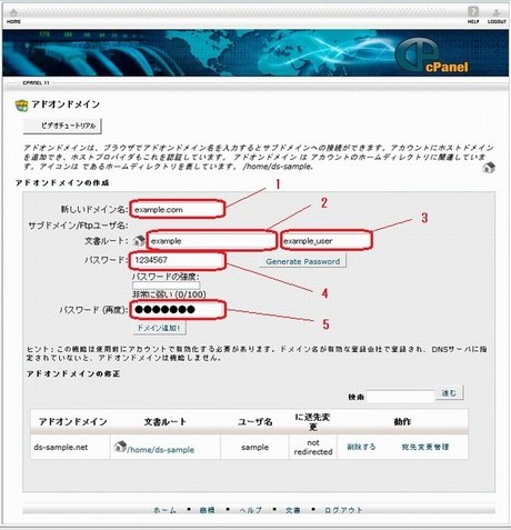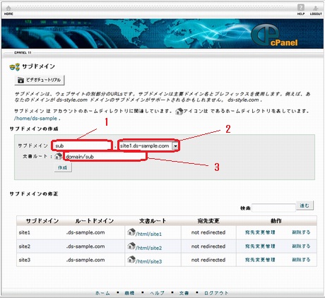 サブドメインの設定はメインドメインの設定とほとんど同じである。1には、メインドメインに対する子の部分を入力する。アドオンドメインで設定したのが「example.com」で、「sub.example.com」というサブドメインを作りたいのであれば、「sub」を入れるということになる。