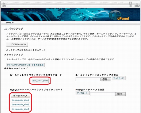 自分の領域内(ホームディレクトリ)にあるファイルすべてと、データベースのファイルを現在の状態でダウンロード出来る。それぞれgzipで圧縮されており、展開すればサーバにある通りのファイル構成で復元出来る。