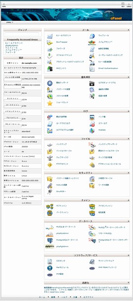 コントロールパネルでは、ドメイン及びサブドメインの設定、バックアップの取得、データベースの開設、メールアドレスの作成、アクセスログの閲覧など、ユーザがサーバを使うにあたって必要な設定を行える。
