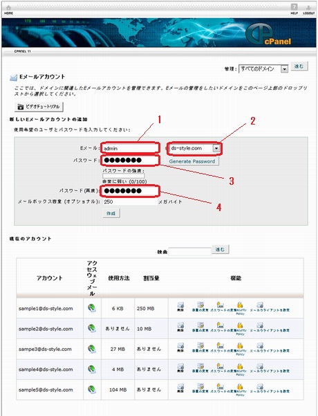 サーバをメールサーバとしても使いたいという場合だが、cPanelでメールアドレスを作れる。1で@の前にくるアカウント名を入れ、2で設定済みのメインドメイン、もしくはサブドメインを選択、3にメール用のパスワード、4に3に入れたものと同じものを入力し、作成ボタンを押せばよい。