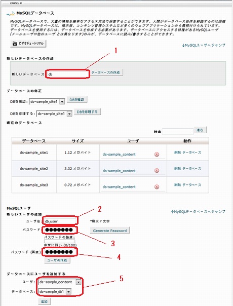 3でパスワードを決めて、4に3で入力したものを再入力、データベース作成の最大のポイントは5で、1で「db」という名前のデータベースを作成し、2で「db_user」というユーザを作成した場合、5でユーザとして「db_user」、データベースとして「db」を選択し、追加ボタンをクリックする。つまり、作成したユーザとデータベースの紐づけ作業を行うのだ。これで「db」に、3で決めたパスワードで「db_user」としてログイン出来るということになる。なお、データベース名、ユーザ名、それぞれに接頭語がつくこともある。