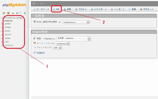cPanelのphpMyAdminアイコンをクリックすると、ダイレクトにphpMyadminへと飛ぶ。まず、1の部分で開設したデータベースの名前を選択しよう。その後、2の「SQL」というリンクをクリックする。なお、phpMyAdminはサーバによってインストールされているバージョンが異なり、また、バージョンが異なると外観がかなり違う場合があるので、必ず上の画像通りの画面が表示されるとは限らない。