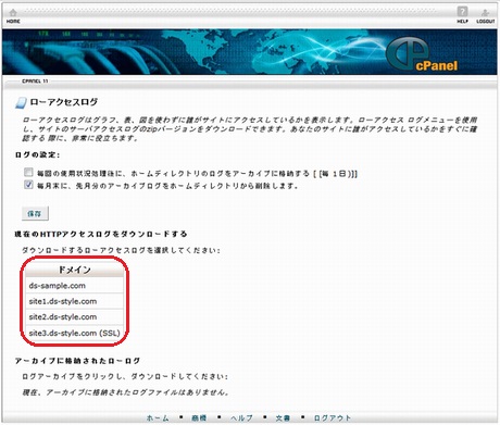 赤で囲った領域内にあるドメインをクリックすると、そのドメインで運営しているサイトの、リアルタイムのアクセスログをダウンロード出来る。gzipで圧縮されているので、ログをエディタなどで開くには解凍が必要。見やすい形にしたい場合は、WebLog Expertなどのグラフィカルなアクセスログ解析ソフトで読み込むといいだろう。